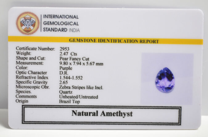 Beautiful 2.47 Cts Natural Amethyst (Top-Mines) sva 2+ Ratti AMETHYST. Free Horoscope & Free Pundit Ji Astrological Advise / Consultation. Original Natural Lab certified gems by IGI GTL / Birth stones / Large Gem Selection of shree shubh Rashi Ratan Vedic dhan at Gem Mines. May Bhagwan Brahma, Vishnu, Shiv & Universe bless you.