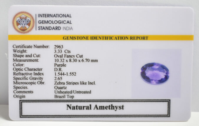 Beautiful 3.33 Cts Natural Amethyst (Top-Mines) sva 3+ Ratti AMETHYST. Free Horoscope & Free Pundit Ji Astrological Advise / Consultation. Original Natural Lab certified gems by IGI GTL / Birth stones / Large Gem Selection of shree shubh Rashi Ratan Vedic dhan at Gem Mines. May Bhagwan Brahma, Vishnu, Shiv & Universe bless you.