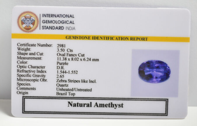 Beautiful 3.5 Cts Natural Amethyst (Top-Mines) sva 3+ Ratti AMETHYST. Free Horoscope & Free Pundit Ji Astrological Advise / Consultation. Original Natural Lab certified gems by IGI GTL / Birth stones / Large Gem Selection of shree shubh Rashi Ratan Vedic dhan at Gem Mines. May Bhagwan Brahma, Vishnu, Shiv & Universe bless you.