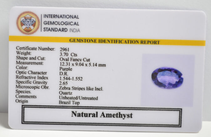 Beautiful 3.7 Cts Natural Amethyst (Top-Mines) sva 4+ Ratti AMETHYST. Free Horoscope & Free Pundit Ji Astrological Advise / Consultation. Original Natural Lab certified gems by IGI GTL / Birth stones / Large Gem Selection of shree shubh Rashi Ratan Vedic dhan at Gem Mines. May Bhagwan Brahma, Vishnu, Shiv & Universe bless you.
