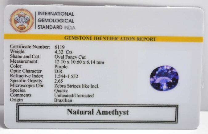 Beautiful 4.32 Cts Natural Amethyst (Top+-Mines) sva 4+ Ratti AMETHYST. Free Horoscope & Free Pundit Ji Astrological Advise / Consultation. Original Natural Lab certified gems by IGI GTL / Birth stones / Large Gem Selection of shree shubh Rashi Ratan Vedic dhan at Gem Mines. May Bhagwan Brahma, Vishnu, Shiv & Universe bless you.