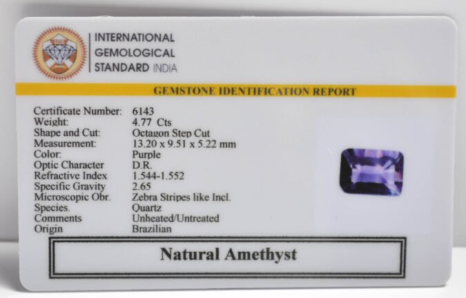 Beautiful 4.77 Cts Natural Amethyst (Top+-Mines) sva 5+ Ratti AMETHYST. Free Horoscope & Free Pundit Ji Astrological Advise / Consultation. Original Natural Lab certified gems by IGI GTL / Birth stones / Large Gem Selection of shree shubh Rashi Ratan Vedic dhan at Gem Mines. May Bhagwan Brahma, Vishnu, Shiv & Universe bless you.