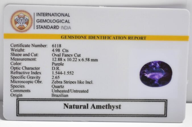 Beautiful 4.98 Cts Natural Amethyst (Top+-Mines) sva 5+ Ratti AMETHYST. Free Horoscope & Free Pundit Ji Astrological Advise / Consultation. Original Natural Lab certified gems by IGI GTL / Birth stones / Large Gem Selection of shree shubh Rashi Ratan Vedic dhan at Gem Mines. May Bhagwan Brahma, Vishnu, Shiv & Universe bless you.