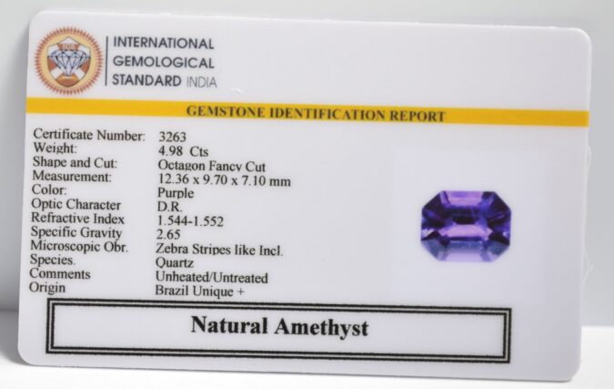 Beautiful 4.98 Cts Natural Amethyst (AAA+-Mines) sva 5+ Ratti AMETHYST. Free Horoscope & Free Pundit Ji Astrological Advise / Consultation. Original Natural Lab certified gems by IGI GTL / Birth stones / Large Gem Selection of shree shubh Rashi Ratan Vedic dhan at Gem Mines. May Bhagwan Brahma, Vishnu, Shiv & Universe bless you.