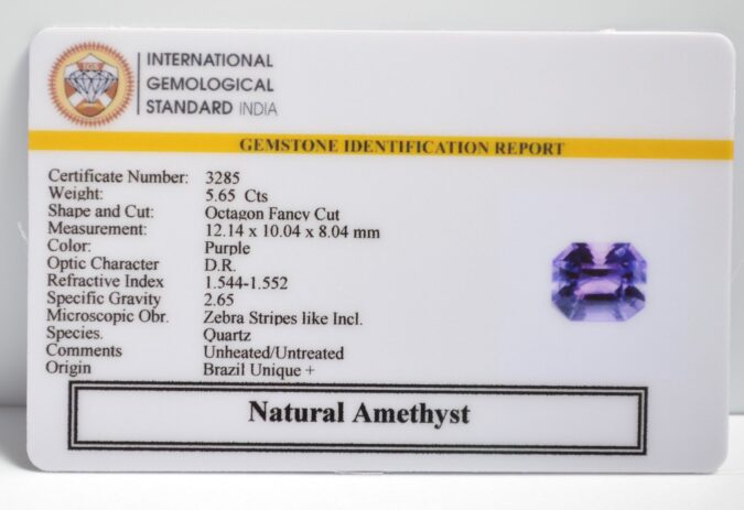 Beautiful 5.65 Cts Natural Amethyst (AAA+-Mines) sva 6+ Ratti AMETHYST. Free Horoscope & Free Pundit Ji Astrological Advise / Consultation. Original Natural Lab certified gems by IGI GTL / Birth stones / Large Gem Selection of shree shubh Rashi Ratan Vedic dhan at Gem Mines. May Bhagwan Brahma, Vishnu, Shiv & Universe bless you.
