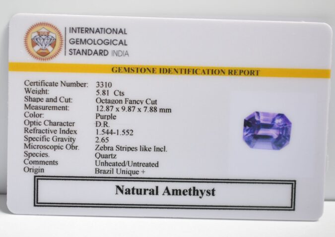 Beautiful 5.81 Cts Natural Amethyst (Top+-Mines) sva 6+ Ratti AMETHYST. Free Horoscope & Free Pundit Ji Astrological Advise / Consultation. Original Natural Lab certified gems by IGI GTL / Birth stones / Large Gem Selection of shree shubh Rashi Ratan Vedic dhan at Gem Mines. May Bhagwan Brahma, Vishnu, Shiv & Universe bless you.