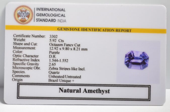 Beautiful 5.92 Cts Natural Amethyst (Top+-Mines) sva 6+ Ratti AMETHYST. Free Horoscope & Free Pundit Ji Astrological Advise / Consultation. Original Natural Lab certified gems by IGI GTL / Birth stones / Large Gem Selection of shree shubh Rashi Ratan Vedic dhan at Gem Mines. May Bhagwan Brahma, Vishnu, Shiv & Universe bless you.