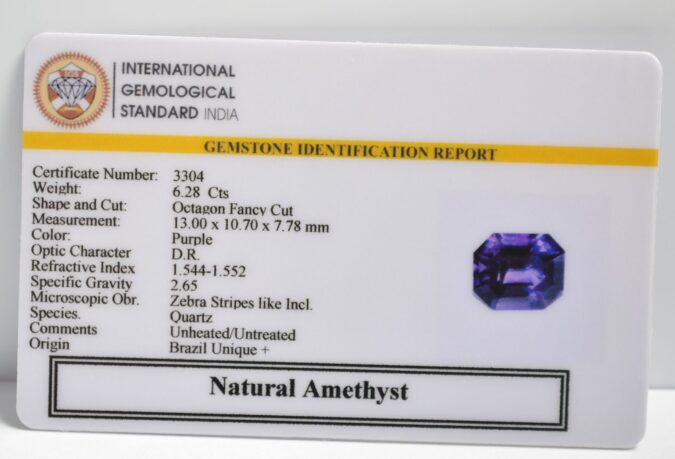 Beautiful 6.28 Cts Natural Amethyst (Unique +-Mines) sva 6+ Ratti AMETHYST. Free Horoscope & Free Pundit Ji Astrological Advise / Consultation. Original Natural Lab certified gems by IGI GTL / Birth stones / Large Gem Selection of shree shubh Rashi Ratan Vedic dhan at Gem Mines. May Bhagwan Brahma, Vishnu, Shiv & Universe bless you.