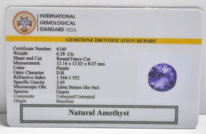 Beautiful 6.28 Cts Natural Amethyst (Top+-Mines) sva 6+ Ratti AMETHYST. Free Horoscope & Free Pundit Ji Astrological Advise / Consultation. Original Natural Lab certified gems by IGI GTL / Birth stones / Large Gem Selection of shree shubh Rashi Ratan Vedic dhan at Gem Mines. May Bhagwan Brahma, Vishnu, Shiv & Universe bless you.