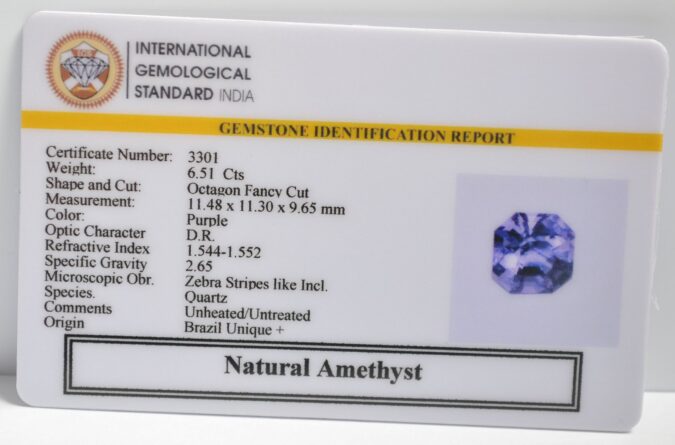 Beautiful 6.51 Cts Natural Amethyst (Unique +-Mines) sva 7+ Ratti AMETHYST. Free Horoscope & Free Pundit Ji Astrological Advise / Consultation. Original Natural Lab certified gems by IGI GTL / Birth stones / Large Gem Selection of shree shubh Rashi Ratan Vedic dhan at Gem Mines. May Bhagwan Brahma, Vishnu, Shiv & Universe bless you.