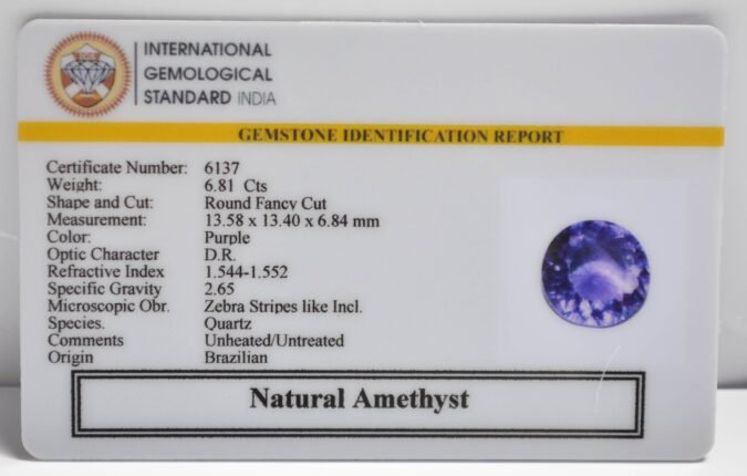 Beautiful 6.81 Cts Natural Amethyst (Top+-Mines) sva 7+ Ratti AMETHYST. Free Horoscope & Free Pundit Ji Astrological Advise / Consultation. Original Natural Lab certified gems by IGI GTL / Birth stones / Large Gem Selection of shree shubh Rashi Ratan Vedic dhan at Gem Mines. May Bhagwan Brahma, Vishnu, Shiv & Universe bless you.