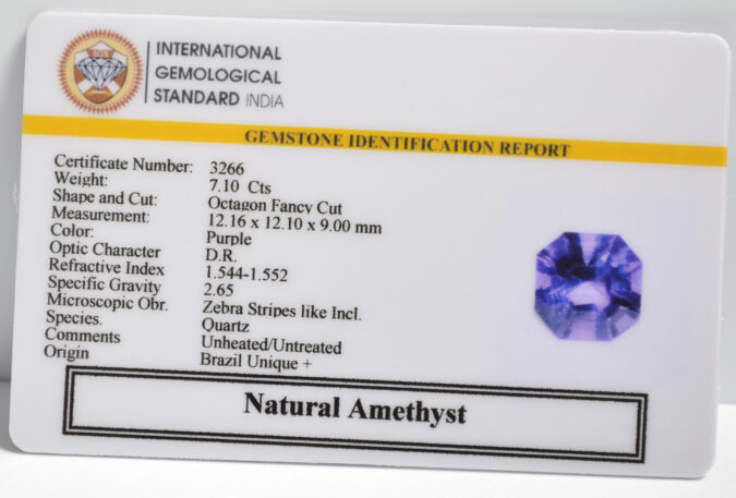 Beautiful 7.1 Cts Natural Amethyst (Unique +-Mines) sva 7+ Ratti AMETHYST. Free Horoscope & Free Pundit Ji Astrological Advise / Consultation. Original Natural Lab certified gems by IGI GTL / Birth stones / Large Gem Selection of shree shubh Rashi Ratan Vedic dhan at Gem Mines. May Bhagwan Brahma, Vishnu, Shiv & Universe bless you.