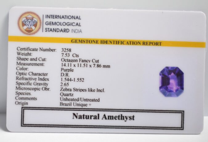 Beautiful 7.53 Cts Natural Amethyst (Unique +-Mines) sva 8+ Ratti AMETHYST. Free Horoscope & Free Pundit Ji Astrological Advise / Consultation. Original Natural Lab certified gems by IGI GTL / Birth stones / Large Gem Selection of shree shubh Rashi Ratan Vedic dhan at Gem Mines. May Bhagwan Brahma, Vishnu, Shiv & Universe bless you.