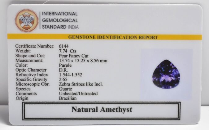 Beautiful 7.74 Cts Natural Amethyst (Top+-Mines) sva 8+ Ratti AMETHYST. Free Horoscope & Free Pundit Ji Astrological Advise / Consultation. Original Natural Lab certified gems by IGI GTL / Birth stones / Large Gem Selection of shree shubh Rashi Ratan Vedic dhan at Gem Mines. May Bhagwan Brahma, Vishnu, Shiv & Universe bless you.