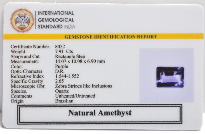 Beautiful 7.91 Cts Natural Amethyst (Top-Mines) sva 8+ Ratti AMETHYST. Free Horoscope & Free Pundit Ji Astrological Advise / Consultation. Original Natural Lab certified gems by IGI GTL / Birth stones / Large Gem Selection of shree shubh Rashi Ratan Vedic dhan at Gem Mines. May Bhagwan Brahma, Vishnu, Shiv & Universe bless you.