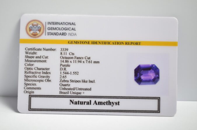 Beautiful 8.11 Cts Natural Amethyst (Unique +-Mines) sva 9+ Ratti AMETHYST. Free Horoscope & Free Pundit Ji Astrological Advise / Consultation. Original Natural Lab certified gems by IGI GTL / Birth stones / Large Gem Selection of shree shubh Rashi Ratan Vedic dhan at Gem Mines. May Bhagwan Brahma, Vishnu, Shiv & Universe bless you.