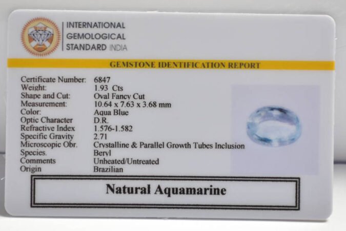 Beautiful 1.93 Cts Natural Aquamarine (AAA+-Mines) sva 2+ Ratti AQUAMARINE. Free Horoscope & Free Pundit Ji Astrological Advise / Consultation. Original Natural Lab certified gems by IGI GTL / Birth stones / Large Gem Selection of shree shubh Rashi Ratan Vedic dhan at Gem Mines. May Bhagwan Brahma, Vishnu, Shiv & Universe bless you.