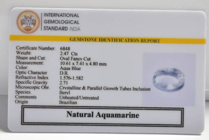 Beautiful 2.47 Cts Natural Aquamarine (AAA+-Mines) sva 2+ Ratti AQUAMARINE. Free Horoscope & Free Pundit Ji Astrological Advise / Consultation. Original Natural Lab certified gems by IGI GTL / Birth stones / Large Gem Selection of shree shubh Rashi Ratan Vedic dhan at Gem Mines. May Bhagwan Brahma, Vishnu, Shiv & Universe bless you.
