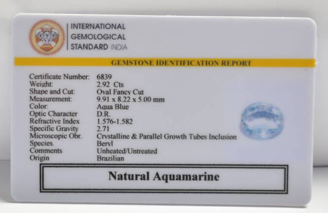 Beautiful 2.92 Cts Natural Aquamarine (Top-Mines) sva 3+ Ratti AQUAMARINE. Free Horoscope & Free Pundit Ji Astrological Advise / Consultation. Original Natural Lab certified gems by IGI GTL / Birth stones / Large Gem Selection of shree shubh Rashi Ratan Vedic dhan at Gem Mines. May Bhagwan Brahma, Vishnu, Shiv & Universe bless you.