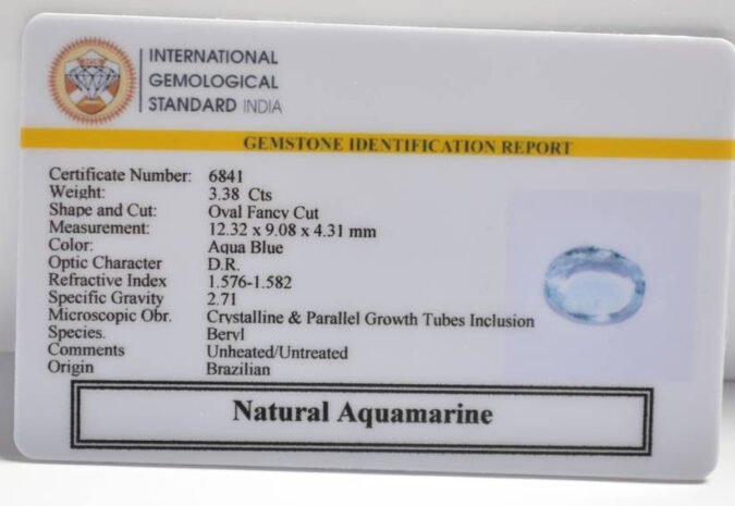 Beautiful 3.38 Cts Natural Aquamarine (Top-Mines) sva 3+ Ratti AQUAMARINE. Free Horoscope & Free Pundit Ji Astrological Advise / Consultation. Original Natural Lab certified gems by IGI GTL / Birth stones / Large Gem Selection of shree shubh Rashi Ratan Vedic dhan at Gem Mines. May Bhagwan Brahma, Vishnu, Shiv & Universe bless you.