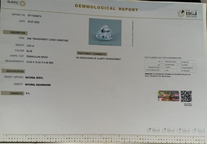Beautiful 3.65 Cts Natural Aquamarine (AAA+-Mines) sva 4+ Ratti AQUAMARINE. Free Horoscope & Free Pundit Ji Astrological Advise / Consultation. Original Natural Lab certified gems by IGI GTL / Birth stones / Large Gem Selection of shree shubh Rashi Ratan Vedic dhan at Gem Mines. May Bhagwan Brahma, Vishnu, Shiv & Universe bless you.