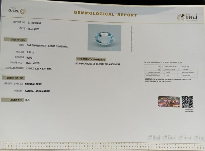 Beautiful 3.81 Cts Natural Aquamarine (AAA+-Mines) sva 4+ Ratti AQUAMARINE. Free Horoscope & Free Pundit Ji Astrological Advise / Consultation. Original Natural Lab certified gems by IGI GTL / Birth stones / Large Gem Selection of shree shubh Rashi Ratan Vedic dhan at Gem Mines. May Bhagwan Brahma, Vishnu, Shiv & Universe bless you.