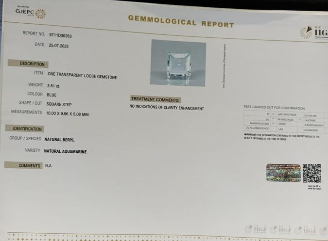 Beautiful 3.81 Cts Natural Aquamarine (AAA+-Mines) sva 4+ Ratti AQUAMARINE. Free Horoscope & Free Pundit Ji Astrological Advise / Consultation. Original Natural Lab certified gems by IGI GTL / Birth stones / Large Gem Selection of shree shubh Rashi Ratan Vedic dhan at Gem Mines. May Bhagwan Brahma, Vishnu, Shiv & Universe bless you.
