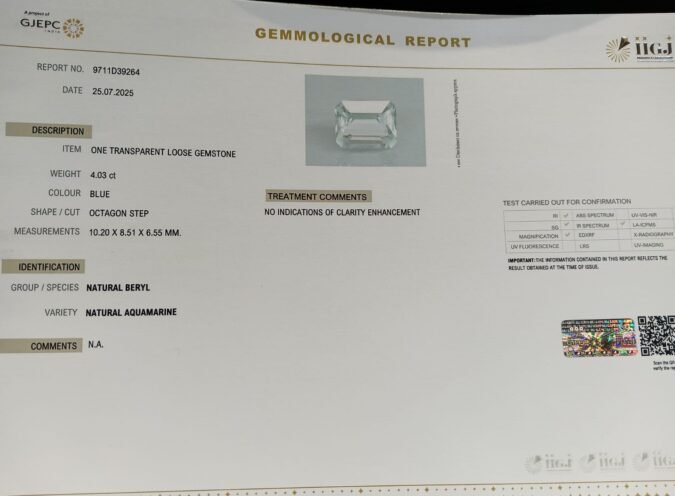 Beautiful 4.03 Cts Natural Aquamarine (AAA+-Mines) sva 4+ Ratti AQUAMARINE. Free Horoscope & Free Pundit Ji Astrological Advise / Consultation. Original Natural Lab certified gems by IGI GTL / Birth stones / Large Gem Selection of shree shubh Rashi Ratan Vedic dhan at Gem Mines. May Bhagwan Brahma, Vishnu, Shiv & Universe bless you.