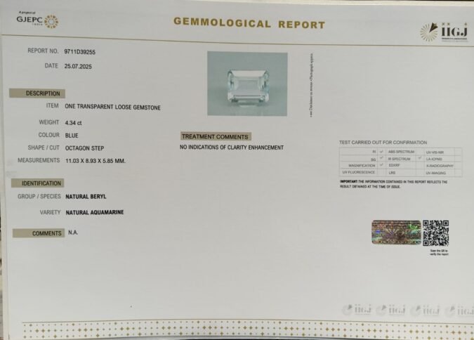 Beautiful 4.34 Cts Natural Aquamarine (AAA+-Mines) sva 4+ Ratti AQUAMARINE. Free Horoscope & Free Pundit Ji Astrological Advise / Consultation. Original Natural Lab certified gems by IGI GTL / Birth stones / Large Gem Selection of shree shubh Rashi Ratan Vedic dhan at Gem Mines. May Bhagwan Brahma, Vishnu, Shiv & Universe bless you.