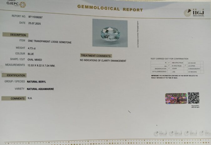 Beautiful 4.73 Cts Natural Aquamarine (AAA+-Mines) sva 5+ Ratti AQUAMARINE. Free Horoscope & Free Pundit Ji Astrological Advise / Consultation. Original Natural Lab certified gems by IGI GTL / Birth stones / Large Gem Selection of shree shubh Rashi Ratan Vedic dhan at Gem Mines. May Bhagwan Brahma, Vishnu, Shiv & Universe bless you.