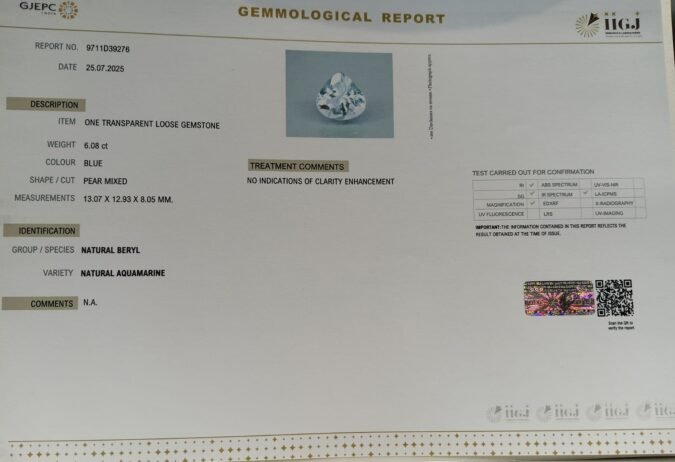 Beautiful 6.08 Cts Natural Aquamarine (Top-Mines) sva 6+ Ratti AQUAMARINE. Free Horoscope & Free Pundit Ji Astrological Advise / Consultation. Original Natural Lab certified gems by IGI GTL / Birth stones / Large Gem Selection of shree shubh Rashi Ratan Vedic dhan at Gem Mines. May Bhagwan Brahma, Vishnu, Shiv & Universe bless you.
