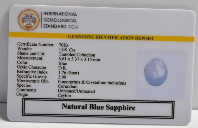 Beautiful 1.08 Cts Natural Blue Sapphire (Very Good-Mines) sva 1+ Ratti BLUE SAPPHIRE. Free Horoscope & Free Pundit Ji Astrological Advise / Consultation. Original Natural Lab certified gems by IGI GTL / Birth stones / Large Gem Selection of shree shubh Rashi Ratan Vedic dhan at Gem Mines. May Bhagwan Brahma, Vishnu, Shiv & Universe bless you.