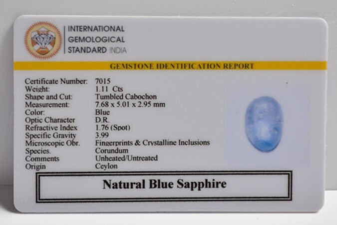 Beautiful 1.11 Cts Natural Blue Sapphire (Very Good-Mines) sva 1+ Ratti BLUE SAPPHIRE. Free Horoscope & Free Pundit Ji Astrological Advise / Consultation. Original Natural Lab certified gems by IGI GTL / Birth stones / Large Gem Selection of shree shubh Rashi Ratan Vedic dhan at Gem Mines. May Bhagwan Brahma, Vishnu, Shiv & Universe bless you.