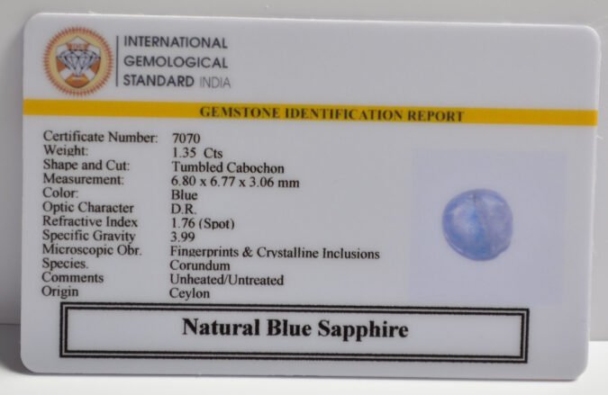 Beautiful 1.35 Cts Natural Blue Sapphire (Very Good-Mines) sva 1+ Ratti BLUE SAPPHIRE. Free Horoscope & Free Pundit Ji Astrological Advise / Consultation. Original Natural Lab certified gems by IGI GTL / Birth stones / Large Gem Selection of shree shubh Rashi Ratan Vedic dhan at Gem Mines. May Bhagwan Brahma, Vishnu, Shiv & Universe bless you.