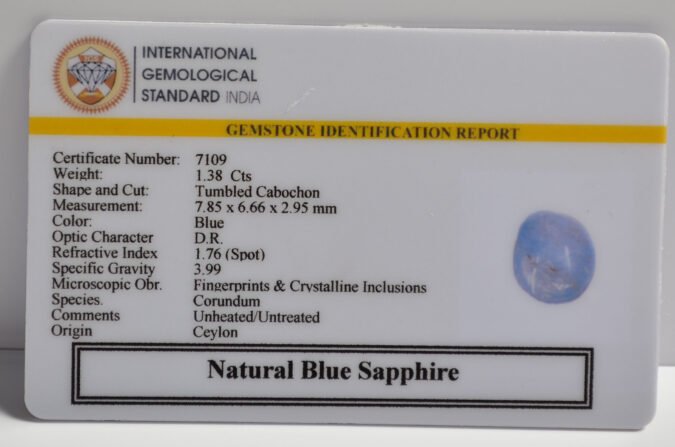 Beautiful 1.38 Cts Natural Blue Sapphire (Very Good-Mines) sva 1+ Ratti BLUE SAPPHIRE. Free Horoscope & Free Pundit Ji Astrological Advise / Consultation. Original Natural Lab certified gems by IGI GTL / Birth stones / Large Gem Selection of shree shubh Rashi Ratan Vedic dhan at Gem Mines. May Bhagwan Brahma, Vishnu, Shiv & Universe bless you.