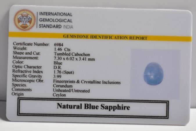 Beautiful 1.46 Cts Natural Blue Sapphire (Very Good-Mines) sva 1+ Ratti BLUE SAPPHIRE. Free Horoscope & Free Pundit Ji Astrological Advise / Consultation. Original Natural Lab certified gems by IGI GTL / Birth stones / Large Gem Selection of shree shubh Rashi Ratan Vedic dhan at Gem Mines. May Bhagwan Brahma, Vishnu, Shiv & Universe bless you.