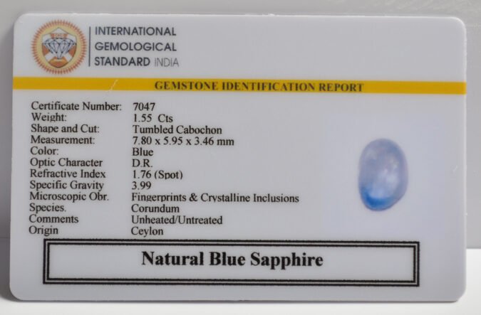Beautiful 1.55 Cts Natural Blue Sapphire (Very Good-Mines) sva 1+ Ratti BLUE SAPPHIRE. Free Horoscope & Free Pundit Ji Astrological Advise / Consultation. Original Natural Lab certified gems by IGI GTL / Birth stones / Large Gem Selection of shree shubh Rashi Ratan Vedic dhan at Gem Mines. May Bhagwan Brahma, Vishnu, Shiv & Universe bless you.