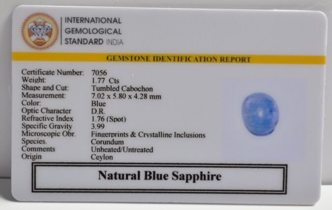 Beautiful 1.77 Cts Natural Blue Sapphire (Very Good-Mines) sva 1+ Ratti BLUE SAPPHIRE. Free Horoscope & Free Pundit Ji Astrological Advise / Consultation. Original Natural Lab certified gems by IGI GTL / Birth stones / Large Gem Selection of shree shubh Rashi Ratan Vedic dhan at Gem Mines. May Bhagwan Brahma, Vishnu, Shiv & Universe bless you.