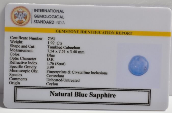 Beautiful 1.92 Cts Natural Blue Sapphire (Very Good-Mines) sva 2+ Ratti BLUE SAPPHIRE. Free Horoscope & Free Pundit Ji Astrological Advise / Consultation. Original Natural Lab certified gems by IGI GTL / Birth stones / Large Gem Selection of shree shubh Rashi Ratan Vedic dhan at Gem Mines. May Bhagwan Brahma, Vishnu, Shiv & Universe bless you.