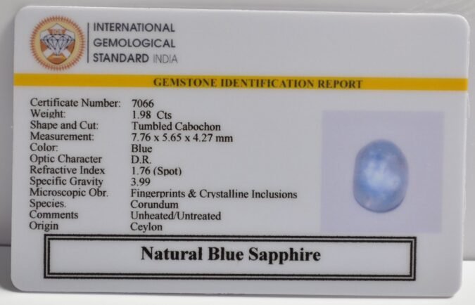 Beautiful 1.98 Cts Natural Blue Sapphire (Very Good-Mines) sva 2+ Ratti BLUE SAPPHIRE. Free Horoscope & Free Pundit Ji Astrological Advise / Consultation. Original Natural Lab certified gems by IGI GTL / Birth stones / Large Gem Selection of shree shubh Rashi Ratan Vedic dhan at Gem Mines. May Bhagwan Brahma, Vishnu, Shiv & Universe bless you.