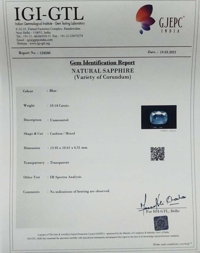 Beautiful 10.14 Ct. Blue Sapphire (Ceylon (Sri Lanka) Mines) Sava 11 Ratti Neelam. Free Horoscope & Free Pundit Ji Advise / Consultation. Original Natural Lab certified gems by IGI GTL / Birth stones / Large Gem Selection of shree shubh Rashi Ratan Vedic dhan at Gem Mines. May Bhagwan Brahma, Vishnu, Shiv & Universe bless you.