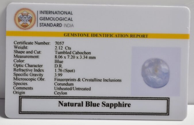 Beautiful 2.12 Cts Natural Blue Sapphire (Good-Mines) sva 2+ Ratti BLUE SAPPHIRE. Free Horoscope & Free Pundit Ji Astrological Advise / Consultation. Original Natural Lab certified gems by IGI GTL / Birth stones / Large Gem Selection of shree shubh Rashi Ratan Vedic dhan at Gem Mines. May Bhagwan Brahma, Vishnu, Shiv & Universe bless you.