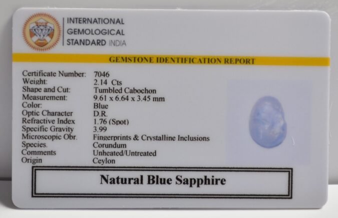 Beautiful 2.14 Cts Natural Blue Sapphire (Good-Mines) sva 2+ Ratti BLUE SAPPHIRE. Free Horoscope & Free Pundit Ji Astrological Advise / Consultation. Original Natural Lab certified gems by IGI GTL / Birth stones / Large Gem Selection of shree shubh Rashi Ratan Vedic dhan at Gem Mines. May Bhagwan Brahma, Vishnu, Shiv & Universe bless you.