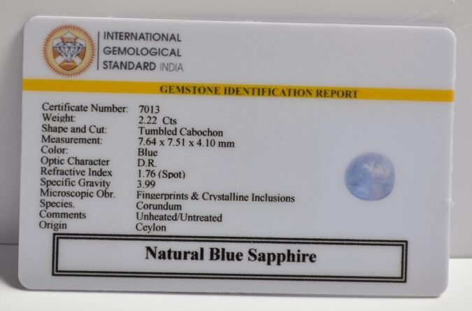 Beautiful 2.22 Cts Natural Blue Sapphire (Very Good-Mines) sva 2+ Ratti BLUE SAPPHIRE. Free Horoscope & Free Pundit Ji Astrological Advise / Consultation. Original Natural Lab certified gems by IGI GTL / Birth stones / Large Gem Selection of shree shubh Rashi Ratan Vedic dhan at Gem Mines. May Bhagwan Brahma, Vishnu, Shiv & Universe bless you.