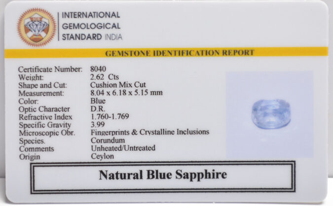 Beautiful 2.62 Cts Natural Blue Sapphire (AAA-Mines) sva 2+ Ratti BLUE SAPPHIRE. Free Horoscope & Free Pundit Ji Astrological Advise / Consultation. Original Natural Lab certified gems by IGI GTL / Birth stones / Large Gem Selection of shree shubh Rashi Ratan Vedic dhan at Gem Mines. May Bhagwan Brahma, Vishnu, Shiv & Universe bless you.