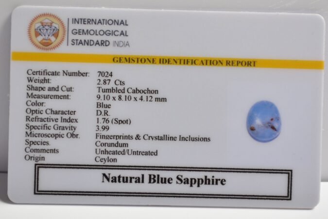 Beautiful 2.87 Cts Natural Blue Sapphire (Very Good-Mines) sva 3+ Ratti BLUE SAPPHIRE. Free Horoscope & Free Pundit Ji Astrological Advise / Consultation. Original Natural Lab certified gems by IGI GTL / Birth stones / Large Gem Selection of shree shubh Rashi Ratan Vedic dhan at Gem Mines. May Bhagwan Brahma, Vishnu, Shiv & Universe bless you.