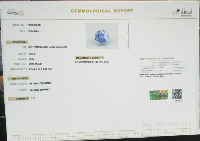 Beautiful 3.08 Cts NATURAL SAPPHIRE (Top-Mines) sva 3+ Ratti BLUE SAPPHIRE. Free Horoscope & Free Pundit Ji Astrological Advise / Consultation. Original Natural Lab certified gems by IGI GTL / Birth stones / Large Gem Selection of shree shubh Rashi Ratan Vedic dhan at Gem Mines. May Bhagwan Brahma, Vishnu, Shiv & Universe bless you.