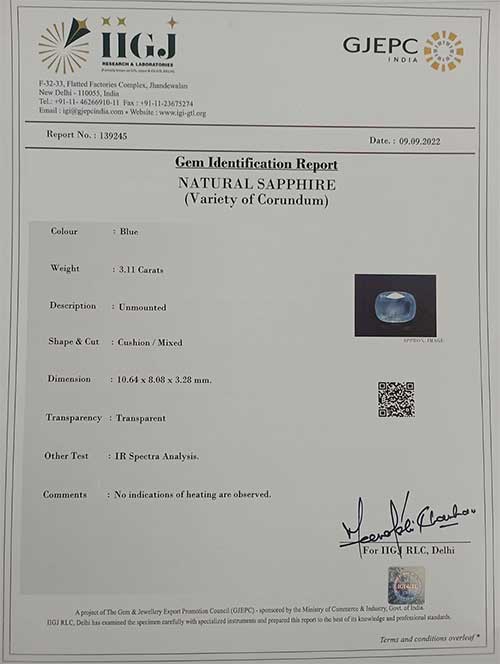 Beautiful 3.11 Ct. Blue Sapphire (Ceylon Mines) Sava 3 Ratti Neelam. Free Horoscope & Free Pundit Ji Advise / Consultation. Original Natural Lab certified gems by IGI GTL / Birth stones / Large Gem Selection of shree shubh Rashi Ratan Vedic dhan at Gem Mines. May Bhagwan Brahma, Vishnu, Shiv & Universe bless you.