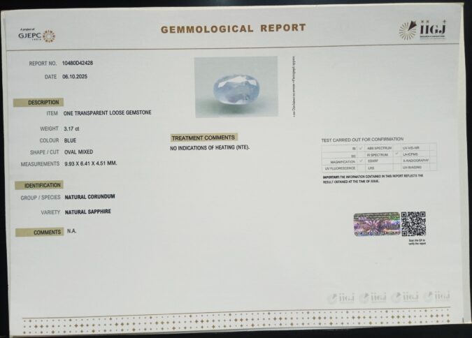 Beautiful 3.17 Cts NATURAL SAPPHIRE (Very Good-Mines) sva 3+ Ratti BLUE SAPPHIRE. Free Horoscope & Free Pundit Ji Astrological Advise / Consultation. Original Natural Lab certified gems by IGI GTL / Birth stones / Large Gem Selection of shree shubh Rashi Ratan Vedic dhan at Gem Mines. May Bhagwan Brahma, Vishnu, Shiv & Universe bless you.