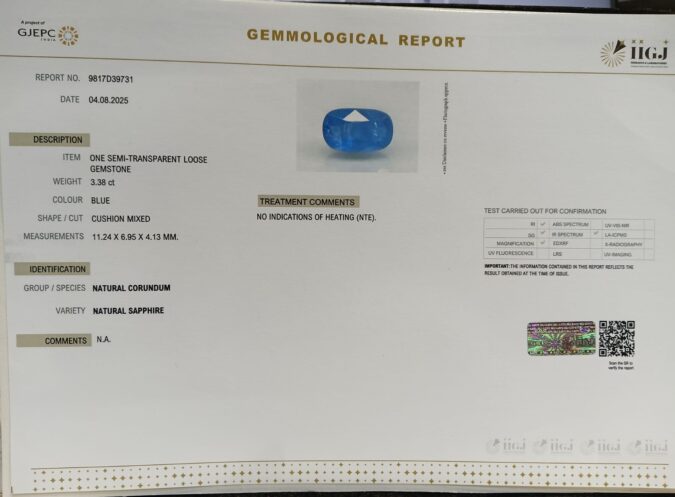 Beautiful 3.38 Cts Natural Blue Sapphire (Top-Mines) sva 3+ Ratti BLUE SAPPHIRE. Free Horoscope & Free Pundit Ji Astrological Advise / Consultation. Original Natural Lab certified gems by IGI GTL / Birth stones / Large Gem Selection of shree shubh Rashi Ratan Vedic dhan at Gem Mines. May Bhagwan Brahma, Vishnu, Shiv & Universe bless you.
